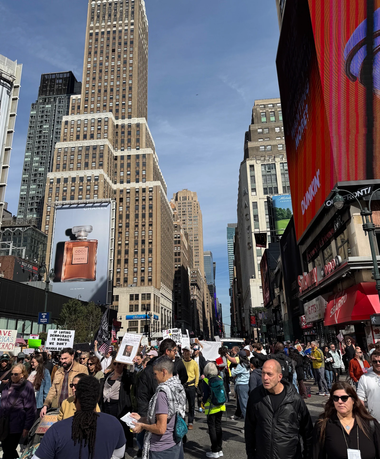 該報導記錄了紐約市警局技術協助應變單位(TARU)在2025年10月18日,於從時代廣場遊行至第14街的抗議活動中,同時部署多達9架Skydio X10無人機飛越群眾上空。這些無人機在離地約60公尺的高度直接飛越人群,但均未配備降落傘回收系統。一名TARU警員向DroneXL記者透露,紐約市警局在2025年已累計執行超過2萬次無人機飛行任務。其中一架無人機與一顆氦氣球險些相撞,差點墜入下方人群。