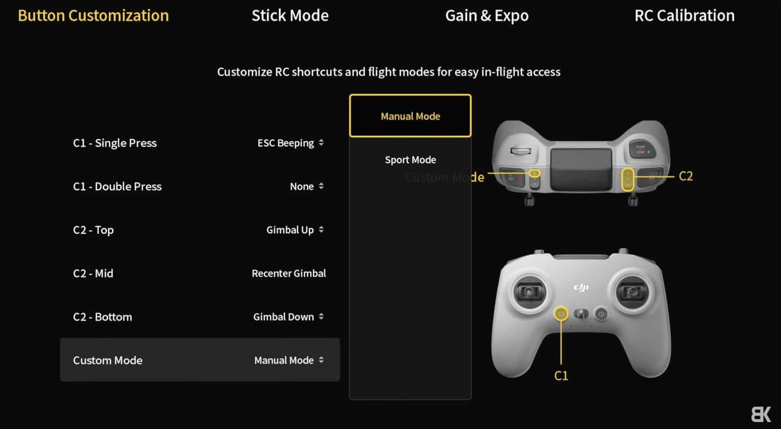 - 最重要的功能是解鎖完整手動飛行模式(Manual Mode),讓專業FPV飛手可以在沒有穩定輔助的情況下自由操控,此外運動模式速度也提升至18m/s,並新增2.7K多幀率拍攝選項和全景拼接校準功能。