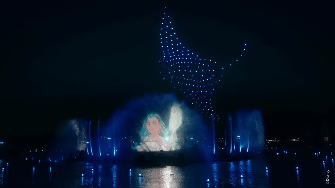 巴黎迪士尼「光之瀑布」中亮相的水上無人機引起廣泛關注。Pancoast 表示,這項技術是 Dronisos 與巴黎迪士尼創意團隊密切合作的成果,將空中與水面編排融為一體的視覺語言。