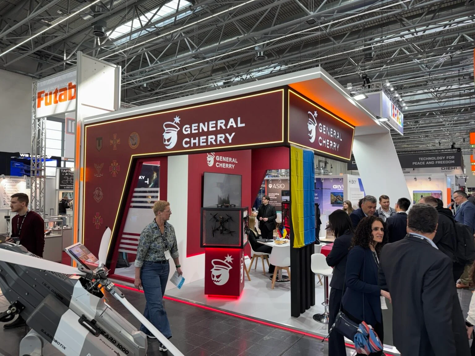 在2026年杜塞道夫XPONENTIAL Europe展覽會場上,General Cherry的展位是全場最大的烏克蘭獨立展位——背光牆面、烏克蘭軍事單位徽章、角落飄揚的烏克蘭國旗,以及連續三天絡繹不絕的參觀人潮。展示桌上擺放著「Bullet」攔截無人機:一架黑色固定翼垂直起降攔截機,配有子彈形機身、四個升力旋翼,售價約2,100美元(約新台幣6.7萬元)。展覽開幕四天前,General Cherry的另一款無人機才剛擊落一架價值1,600萬美元的俄軍Ka-52攻擊直升機。展位上的團隊對此心知肚明,他們不需要多說什麼。